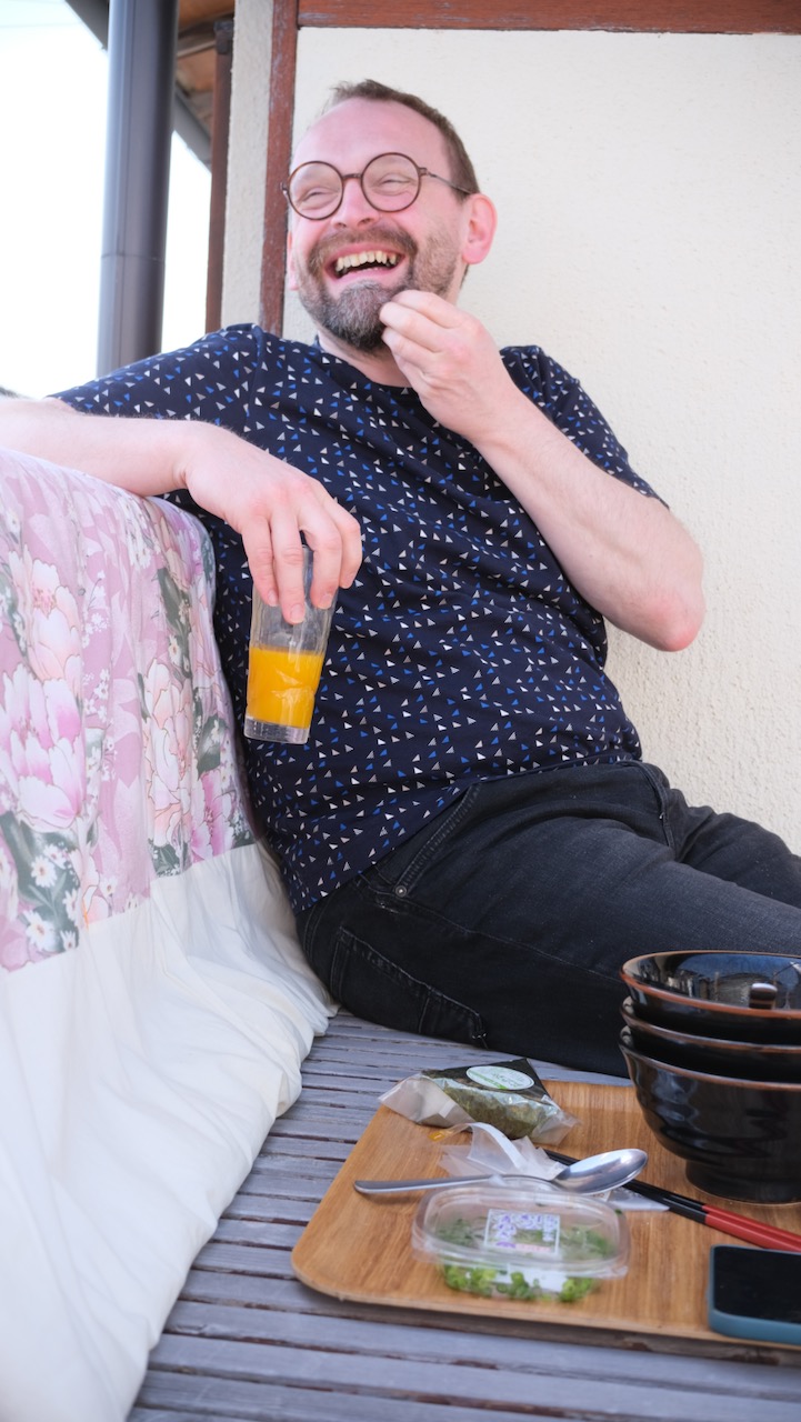 But first, a fresh cup of coffee and a piece of bread on the terrace. Vladimir, still in his nightgown, quickly finishes his plates. Aya comes over to say goodbye to us. We embrace each other warmly. It is very special to get such warm embrace, knowing that she is Japanese. It almost makes me emotional. Vladimir misses his hug. First, he didn’t see us do it. For another, he is rather sparingly dressed and a little embarrassed about it.